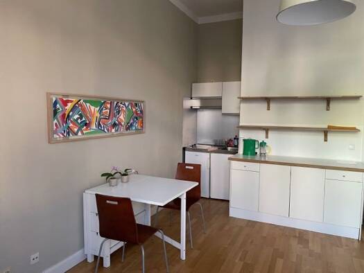 Das helle und ruhige möblierte Einzimmerapartment mit Patry und Duschbad befindet sich in einem renovierten Jugendstilaltbau um 1906, welches durch eine hohen Decken besticht.