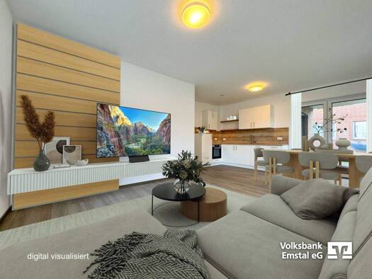 Diese moderne Erdgeschosswohnung bietet auf rund 64 m² ein hochwertiges und komfortables Zuhause in einem barrierearmen Wohngebäude. Der offen gestaltete Wohn-, Koch- und Essbereich wirkt hell und ei...