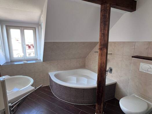 Die Wohnung befindet sich im Dachgeschoss eines Mehrfamilienhauses. Die sichtbaren Balken verleihen dieser Wohnung den gemütlichen Charakter. Mit der niedrigeren Deckenhöhe ist die Wohnung für große Leute nicht geeignet.