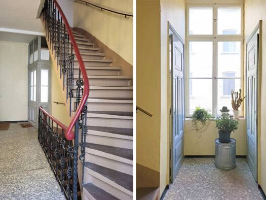 Die Wohnung in Heidelberg-Neuenheim erstreckt sich über 95 Quadratmeter und befindet sich im dritten Obergeschoss eines Hauses aus dem Jahr 1935. Beim Betreten der Wohnung führen zwei Flure in unterschiedliche Richtungen. Geradeaus befindet sich ein separates WC mit Waschbecken und Fenster. Daneben liegt das etwas größere Badezimmer mit Dusche, Waschbecken und ebenfalls einem Fenster. Die Böden in diesem Bereich sind mit schwarzen Fliesen gestaltet. Der Flur in Richtung der Wohnräume ist mit ho...