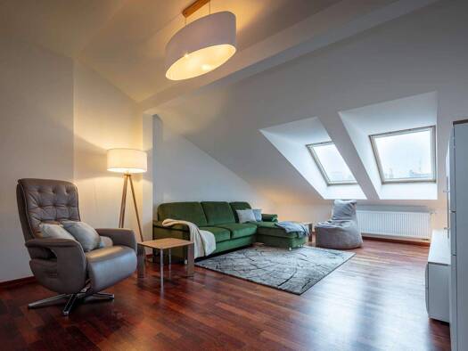 When renting this partially furnished apartment, a 24-month FIXED-TERM LEASE AGREEMENT will be concluded under the specified conditions. Living in the heart of Friedrichshain - temporarily, furnished, and at home. Welcome to your new temporary retreat! This ideally laid-out apartment in the attic (build in 2000) of an old building constructed in 1910 offers an urban lifestyle, yet a quiet location and a maximum of natural sunlight. Worth mentioning: thanks to the elevator, you don't necessarily...