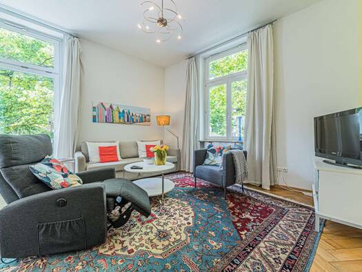 Bitte beachten Sie: Die Wohnung ist komplett möbliert und ausgestattet. Die Gesamtmiete beinhaltet die Nebenkosten. Gesamtmiete 2400,- Eur inklusive Nebenkosten, zzgl. Strom und Gas * Große Wohnung mit Balkon * Saniertes Wannenbad * Lage in ruhigem Wohnviertel * Zwei separate Schlafzimmer saniertes Mehrfamilienhaus (Denkmalgesch?tzter Altbau), Bj. 1912, 2. Etage, kein Lift * Wohnräume: Schönes Wohnzimmer mit Sitzgruppe mit Sofa und SesselGroßes Schlafzimmer mit Boxspring-Bett (160cm) - Kleiders...