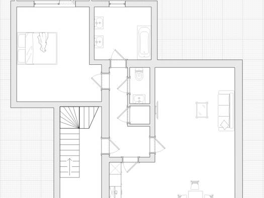 Im Obergeschoss des Hauses befindet sich eine schicke, großzügige 3,5-Zimmerwohnung. Die Wohnung besteht aus einem geräumigen Wohnzimmer, einer großen Küche mit Platz für einen Esstisch, einem Elternschlafzimmer mit eigenem Bad und Ankleidezimmer, einem Kinderzimmer zur Gartenseite, einem Gäste-WC sowie einem weiteren Badezimmer. Beide Bäder verfügen über Duschen mit flacher Duschtasse. Abweichend zum Grundriss ist in der Wohnung keine Badewanne verbaut. Edle Vinylböden in Holzoptik, verbunden ...