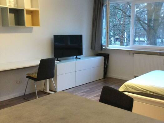 Die Wohnung befindet sich im zentralen Stadtteil Jakobsviertel. Sie ist 50 m² groß und besteht aus einem Wohnzimmer, einem Schlafzimmer, einer ausgestatteten Küche und einem Badezimmer mit Badewanne. Die Wohnung ist komplett möbliert und ausgestattet und verfügt über alles, was man zum Leben braucht: Im Schlafzimmer gibt es ein Bett, einen Nachttisch und einen Kleiderschrank, im Wohnzimmer stehen zwei Schreibtische, ein Sofa und mehrere Regale zum Abstellen von Sachen und in der Küche gibt es e...
