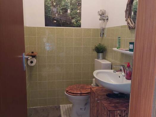 Exklusiv und komplett ausgestattete Wohnung zentral in Chieming. Vom Eingang gelangt man über die Treppe in den Wohnbereich. Im Schlafzimmer befindet sich ein Doppelbett mit Ablagefächern im Kopfteil...