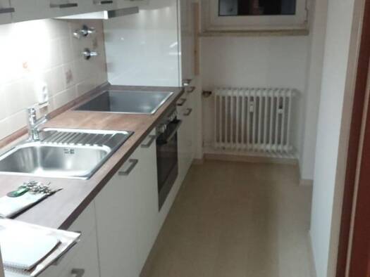 Eine helle und freundliche Wohnung. Wohnzimmer + 2 Schlafzimmer, Einbauküche, Balkon. Ein großer abschließbarer Kellerraum mit Fenster gehört auch dazu. Der Bodenbelag in den Schlafzimmern Laminat Bu...