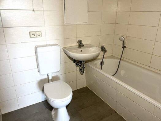 Das helle Wohnzimmer bietet Zugang zum großzügigen Balkon. Das innenliegende Bad ist mit einer Badewanne ausgestattet und bietet Stellfläche und Anschlüsse für eine Waschmaschine. Eine Abstellnische ...