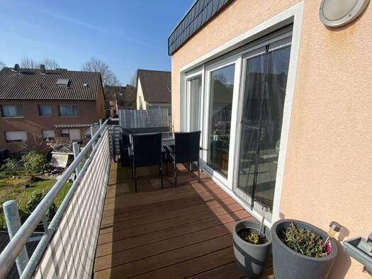 Es handelt sich bei der hier zur Vermietung stehenden Wohnung um eine Maisonettewohnung mit insgesamt drei Zimmern in einem Zweifamilienhaus. Die Wohnung erstreckt sich über das Ober- und Dachgeschoss und verfügt neben dem großen Wohn-Essbereich mit offener Küche und dem Gäste-WC im Obergeschoss über zwei Schlaf- oder Gästezimmer und einem tageslichthellen Bad mit Wanne und Dusche im Dachgeschoss. Vom Wohnzimmer im Obergeschoss erreichen Sie den großen Balkon zur Südseite. Zur Wohnung gehört ei...