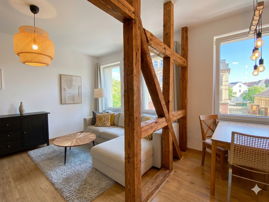 Diese exklusive, hochwertig sanierte 2-Zimmer-Wohnung verbindet auf harmonische Weise historischen Charme mit modernem Wohnkomfort auf höchstem Niveau. Das Herzstück der Immobilie bildet der großzügige und lichtdurchflutete Wohnbereich, in dem eine offene Wohnküche integriert ist. Ein besonderer architektonischer Blickfang sind hierbei die historisch aufgearbeiteten Holzbalken, die als eleganter Raumteiler fungieren und dem Wohnzimmer eine einzigartige, behagliche Atmosphäre verleihen. Für die ...
