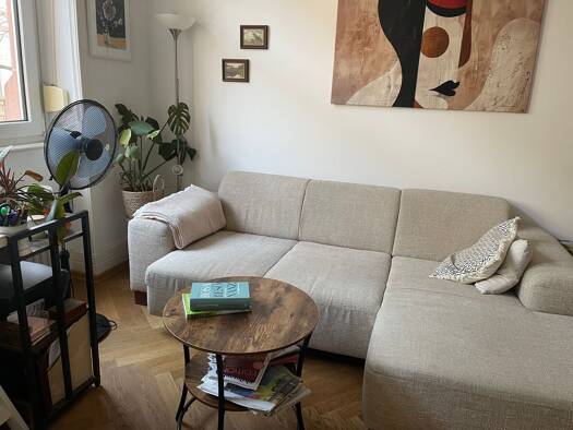 Möblierte 1,5 ZW nähe Eiserner Steg / Museumsufer. Die Wohnung befindet sich in der 3. Etage. Die Wohnung besteht aus einem Wohn-/Schlafbereich, Küche, Flur, Bad und Balkon. Ausstattung: Wohn-/Schlafbereich; großes Bett, großer Kleiderschrank, Sofa, Bestelltisch, Sessel, Leseleuchte, großer Tisch mit Stühlen, TV-Tisch mit TV (Kabelanschluß) div. Kleinmöbel. Einbauküche mit Kühl-/Gefrierkombination, E-Herd, komplett Ausstattung mit Geschirr, Kaffeemaschine, Toaster, Wasserkocher usw.