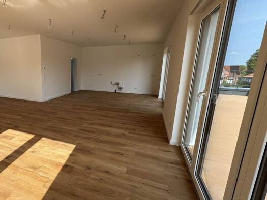 Die Wohnung beeindruckt durch den großzügigen Grundriss einer offenen Küche von fast 15 m², die in den geräumigen Wohnraum von weiteren 32 m² über geht. Im Westen schließt sich der gut 9 m² große Balkon an, der hälftig auf die Wohnfläche angerechnet ist. Die lichte Raumhöhe beträgt 2,75 m. Das Haus ist barrierearm konzipiert: Vom zentralen Treppenhaus mit Aufzug gelangen Sie von der geräumigen Diele in sämtliche Räume dieser großzügigen Wohnung: das 15 m² große Schlafzimmer, das geräumige Tages...