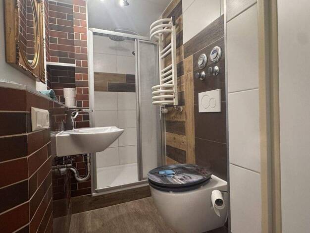 Beim Betreten der Wohnung gelangen Sie zunächst in den Eingangsbereich, in dem sich direkt das WC befindet. Über eine Treppe erreichen Sie den oberen Wohnbereich. Dort erwartet Sie ein kleiner Flur, ...