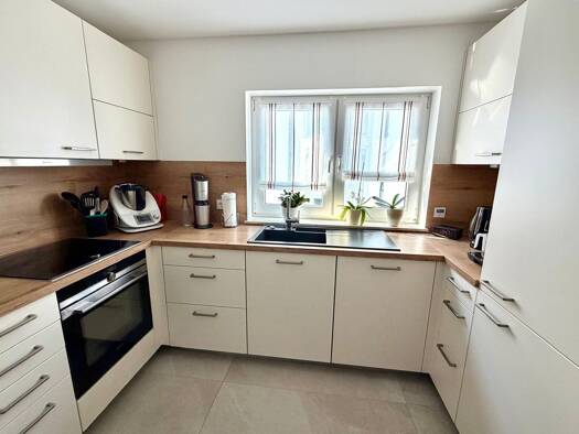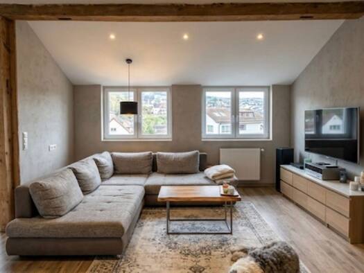 Großzügige und energetisch vollsanierte 4-Zimmer-Wohnung mit ca. 150 m² Wohnfläche. Der Zugang zur Wohnebene erfolgt über ein separates Treppenhaus, was der Immobilie einen ungestörten Haus-in-Haus-Charakter verleiht. Die Wohnräume zeichnen sich durch freigelegte Holzbalken, einen durchgängigen Bodenbelag in Holzoptik und eine hervorragende natürliche Belichtung durch beidseitige Fensterfronten und Dachgauben aus. Die Immobilie wurde aufwendig energetisch saniert und bietet modernste Haustechni...