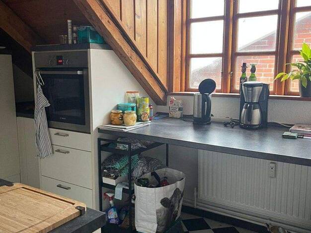 Die Wohnung ist bis in den Giebel ausgebaut. Fußböden: Bodenbelag Planke in Holzoptik. Die offene Küche ist in weiß - Hochglanz. Ausgestattet mit Ceranfeld, Umluftherd, Geschirrspüler und Kühlschrank. Im Bereich des Treppenaufgangs befindet sich ein Einbauschrank. Das kleine Schlafzimmer hat einen Einbauschrank, Fernsehanschluß und Laminatboden. Das Veluxfenster hat einen elektrischen Rollladen zur Verdunklung. Großzügiges gefliestes Bad mit Dusche und Badewanne. In der Hinterfront befindet sic...