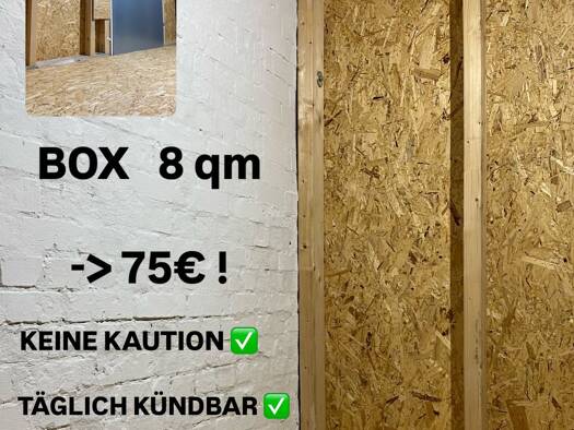 Lagereinheiten: 8 qm -> 75€ / Monat o. 12qm -> 95€/Monat 1 Monat Mindestlaufzeit (täglich kündbar) Keine Nebenkosten , keine Kaution! Lagergebäude ist optisch abgeschirmt und für Unbefugte nicht öffe...
