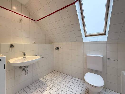 Diese 2-Zimmer-Wohnung mit Süd- / Westbalkon befindet sich im 2. Obergeschoss = Dachgeschoss eines Mehrfamilienhauses. Das Tageslichtbad, in welchem sich auch der Waschmaschinenanschluss befindet, ist mit einer Badewanne ausgestattet. Die Küche ist ebenfalls mit Fenster und offen zum Wohnbereich. Die Einbauküche gehört nicht zur Wohnung. Zur Wohnung gehört ein Außenstellplatz und ein Dachbodenabteil.