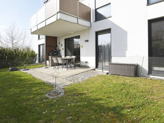 Die 3,5-Zimmer-Wohnung befindet sich im Erdgeschoss eines kleinen Mehrfamilienhauses mit insgesamt fünf Wohneinheiten und erfüllt alle Anforderungen modernen Wohnens. Das Haus wurde 2015 errichtet. Die Wohnung verfügt über einen großzügigen, offenen Wohn- und Essbereich sowie eine Terrasse und einen Gartenanteil. Lichtdurchflutete Räume sorgen für ein angenehmes Wohnambiente, das zum Wohlfühlen einlädt. Sie ist mit Echtholzparkett in Schiffsoptik und großflächigen Feinsteinzeugfliesen ausgestat...