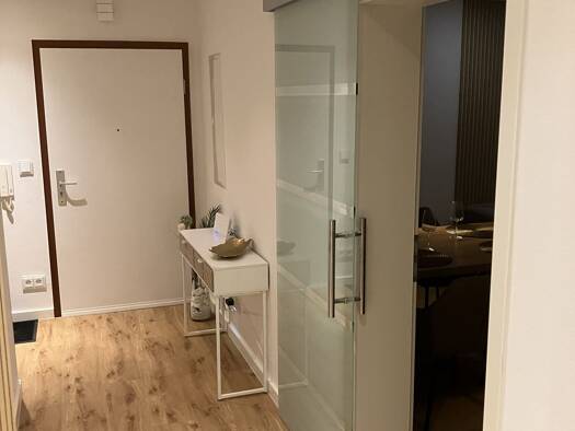 Nach Absprache mit den heutigen Mietern kann auch ein früherer Einzug (01.06.2025) erfolgen. Die Obergeschosswohnung bietet auf einer Fläche von knapp 80 m² zwei Zimmer, Küche, Bad, ein Abstellraum sowie den Flur. Über das modern gestaltete Treppenhaus mit grauer Fliese betritt man den Wohnungsflur mit Garderobennische. Dieser dient als Raumteiler in alle Richtungen und führt im weiteren Verlauf in den offen gestalteten Wohn-/ Essbereich. Diesem ist ein gro0zügige Loggia vorgelagert. Eine ca. 1...