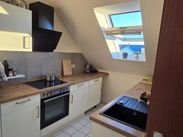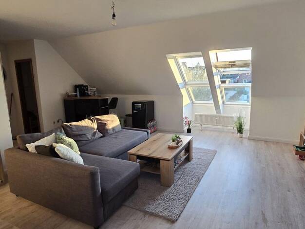 Die Wohnung befindet sich im Dachgeschoss eines Mehrfamilienhauses. Die sichtbaren Balken verleihen dieser Wohnung den gemütlichen Charakter. Mit der niedrigeren Deckenhöhe ist die Wohnung für große Leute nicht geeignet.