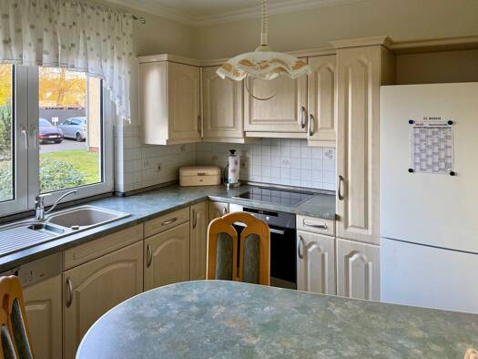 Das Mehrfamilienhaus liegt zentrumsnah in einer guten Wohn- und Verkehrslage im Ort. Es handelt sich um ein massives Wohnhaus mit Nebengebäuden. Das Haus wurde Mitte der 90er Jahre teilsaniert, insbesondere Wärmedämmmassnahmen und Einbau der Heizungsanlage wurde durchgeführt. Küche und Bad verfügen über Fenster. Abstellmöglichkeiten für Fahrzeuge sind vorhanden. Über die Gemeinde ist die Anpachtung eines Garten möglich.