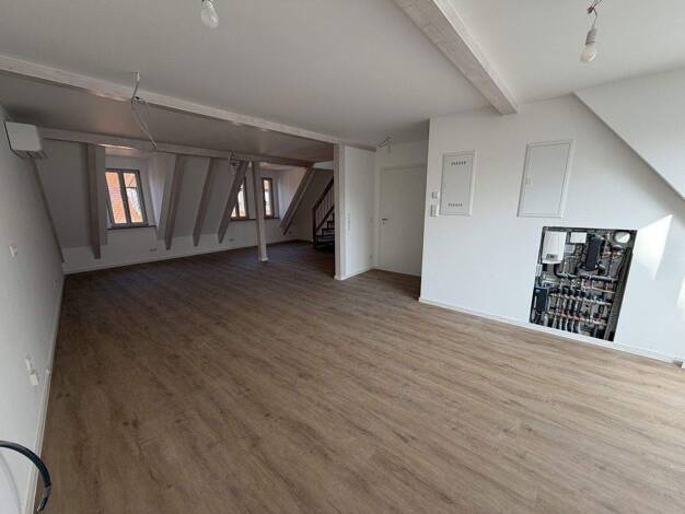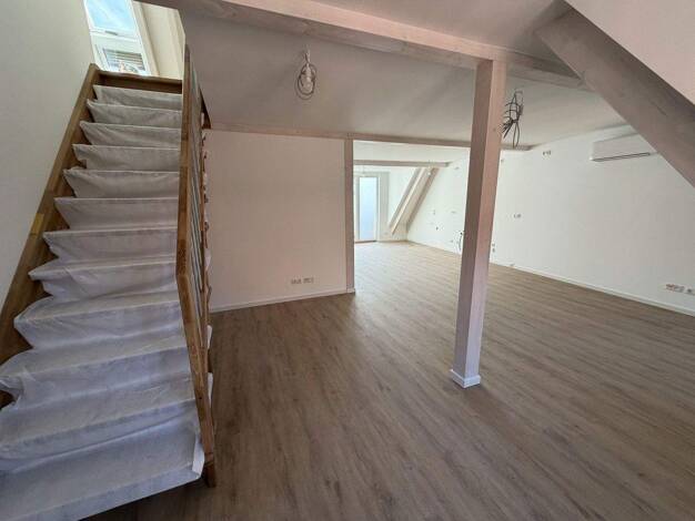 Zur Vermietung steht eine außergewöhnliche Maisonette-Wohnung im Dachgeschoss eines aufwendig kernsanierten Wohn- und Geschäftshauses in der historischen Altstadt von Volkach. Das Gebäude steht unter Ensembleschutz und verbindet den besonderen Charakter eines Altbaus mit modernster Technik und hochwertiger Ausstattung auf Neubaustandard. Die helle Wohnung erstreckt sich über zwei Ebenen und bietet ein modernes Wohnkonzept mit großzügigen, offen gestalteten Bereichen. Im unteren Geschoss befinde...