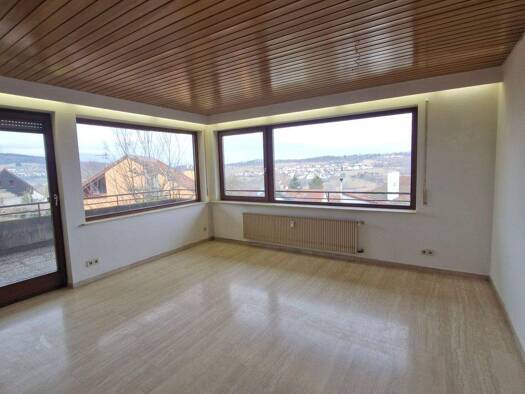 Diese großzügige 3-Zimmer-Wohnung mit ca. 124 m² Wohnfläche überzeugt durch ihre weitläufige Raumgestaltung, massive Bauweise und einen beeindruckenden Ausblick ins Grüne. Herzstück der Wohnung ist der außergewöhnlich große Wohn- und Essbereich mit markanter Holzdecke, hochwertigem Natursteinboden und großen Fensterfronten. Der direkte Zugang auf die großzügige Terrasse eröffnet einen herrlichen Blick über die umliegende Landschaft von Berglen – ein echtes Highlight dieser Immobilie. Ein stilvo...