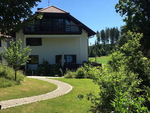 Diese wunderschöne offene lichtdurchflutete Wohnung besticht durch seine Aussicht auf Wiesen und Wald ebenso wie durch seine tolle Ausstattung: - moderne Einbauküche mit Insel - Parkettboden mit Fussbodenheizung - Wintergartenmässiger Erker - Raffrollos zur Beschattung - Möglichkeit zum Anschluss e.Kaminofens - Bad mit Wanne, Dusche u. DuschWC - sep. GästeWC - Grosser Garten mit gemütlichem Sitzplatz und Gerätehaus zur individuellen Bewirtschaftung 2 Stellplätze direkt am Haus Möglichkeit zur I...