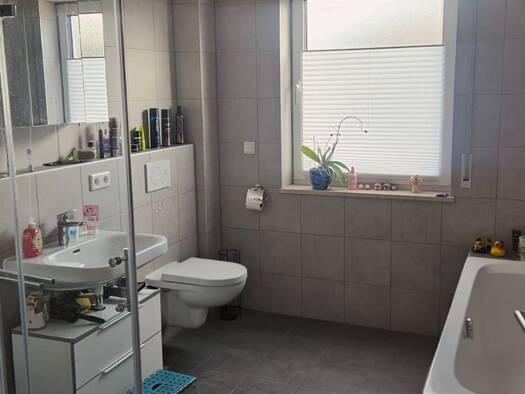 Wohnung im Einfamilienhaus, Eingang direkt von der Garage überdacht, mit eigenem exklusiv genutzten Garten und grosser Terasse mit überdachter Pergola. Es handelt sich um eine Wohnung die über einige Stufen betreten wird, auf der Gartenseite aber ebenerdig ist. Nach dem Windfang betritt man einen zentralen Flur, der in einem sehr grossen Esszuimmer mit viel Licht mündet. Direkt daneben befindet sich die separaten Küche mit Einbauküche (muss nicht abgelöst werden), auch vom Flur betritt man ein ...
