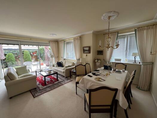 Diese möblierte Wohnung befindet sich im Erdgeschoß eines ruhigen und sehr gepflegten 8 Parteienhauses . Diese stilvoll möblierte 2-Zimmer-Wohnung mit ca. 64 m² Wohnfläche und Garten mit Fassauna (Elektro), Terrasse, Teich, Pkw-Stelllplatz, Kellerraum uvm., bietet ein exklusives Wohnambiente in gefragter Lage. Mit einer großzügigen Fläche von 64 m² bietet es 2 einladende Zimmer und 1 modern ausgestattete Badezimmer mit Dusche, die für zeitgemäßen Komfort sorgen. Diese Wohnung befindet sich in e...