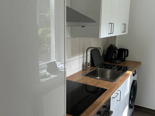 The freshly renovated, modern one-bedroom apartment impresses with its high-quality and cozy furnishings, which create a special living ambience. Even the well-tended garden gives an idea of the high quality of the property. The cozy living room/bedroom is furnished with a comfortable box-spring bed (hotel standard) and impresses with floor-to-ceiling windows that create a bright and friendly atmosphere. The dining table with three chairs invites you to eat and linger together.The one-bedroom a...