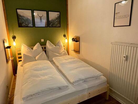 Auf Grund der Bauweise des Hauses hat das Apartment einen eigen Eingang auf der Südseite des Hauses. Es gibt eine recht große, sonnige und voll ausgestattete Küche. Alle Geräte wie Mikrowelle, Kaffeemaschine, Toaster, Geschirr sind vorhanden. Anschließend das Wohnzimmer, ebenfalls Südseite, mit Bett, Sofa, Schrankwand und Fernseher. Ein weiteres Highlight finden Sie im großzügigen Badezimmer mit Fenster, ausgerüstet mit Massage-Eckdusche und Regenwald-Brause. Ebenfalls vorhanden sind Waschmasch...