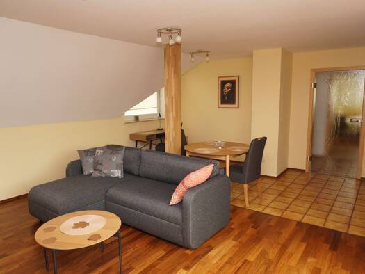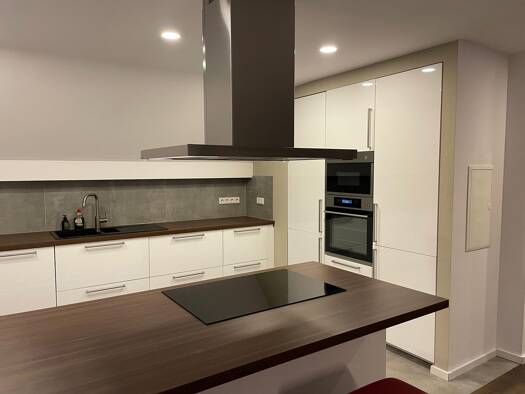 Separate Einliegerwohnung in Zweifamilienhaus - mit Einbauküche: Ceranfeld, Backofen, Geschirrspüler, Kühl-Gefrierkombination, Mikrowelle, Kaffeemaschine sowie Geschirr, Besteck etc.; Wohnzimmer mit ...