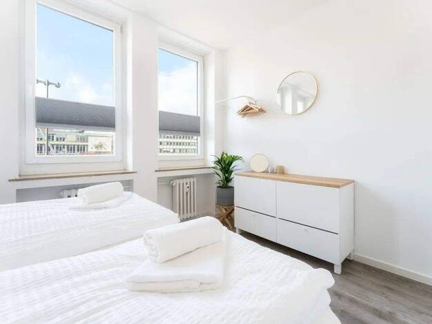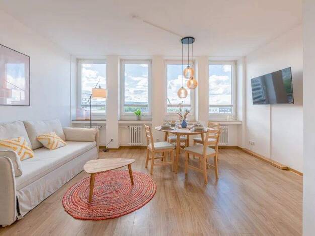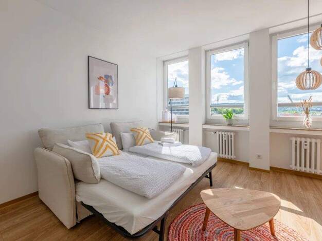 Das moderne Apartment überzeugt mit viel Tageslicht, stilvollem Design und einer gemütlichen Atmosphäre. Der Wohnbereich bietet eine ausziehbare Couch als zusätzlichen Schlafplatz mit Bettwäsche in H...