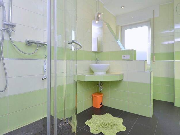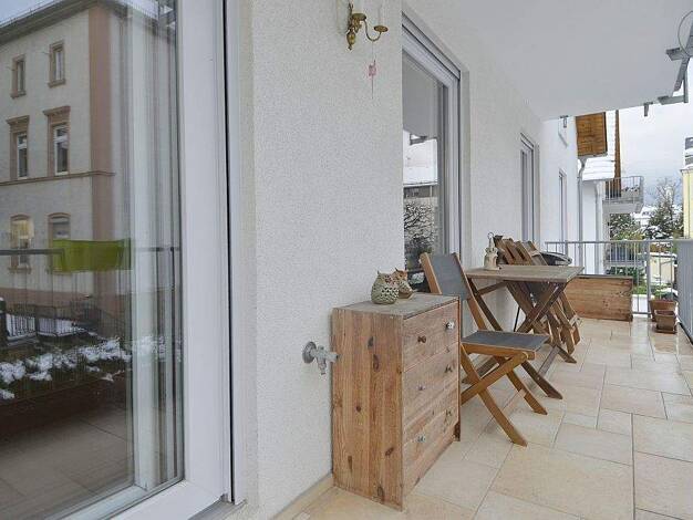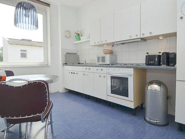 Vom Flur erreichen Sie direkt die praktische eingerichtete Küche, und das Schlafzimmer mit Einbauschränken. Ebenfalls vom Flur erreichen Sie das moderne Tageslichtbad mit Dusche, sowie das großzügige helle Esszimmer von dem man eine tolle Aussicht hat. Das charmante Wohnzimmer mit Einbauschränken und der indirekten Beleuchtung lädt zum entspannen ein.