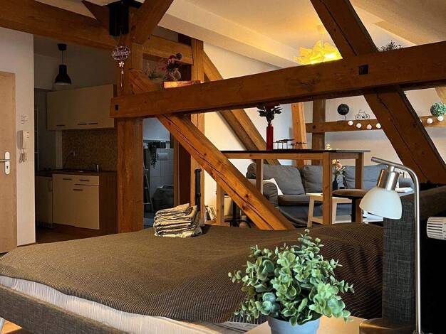 Die großzügige, durch Balken abgetrennte, komplett eingerichtete Einraumwohnung befindet sich direkt im Herzen Stralsunds. Gemütlich eingerichtet ist es ein Ort zum Wohlfühlen für Jedermann. Die Wohnung befindet sich im zweiten Stock und verfügt über eine gut ausgestattete Küchennische und ein großes, helles Badezimmer mit Dusche und Fenster. An dem Schreibtisch kann man bequem seinen Computerarbeitsplatz einrichten. Waschmaschine und Trockner befinden sich im Keller. Für den Fernseh-/ Internet...