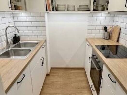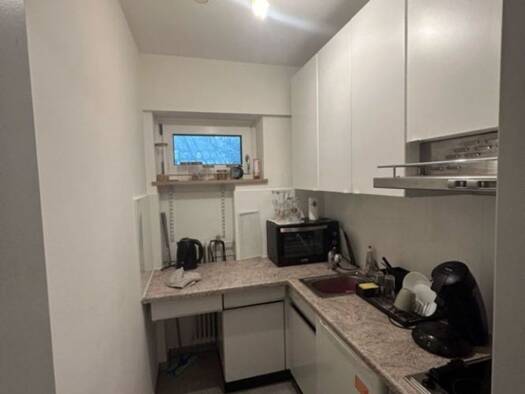 sehr geschmackvolles, schönes 1-Zi. Apartment mit riesigem Balkon zur Rückseite. Blick auf alte "dörfliche" Struktur des Stadteils Au und auf Grünanlagen. Offene Einbauküche mit Frühstücksbar, Schlafbereich locker abgeschirmt mit holzgeschnitzter, halboffener Schiebetür, Bad mit Dusche, Waschmaschine in der Küche integriert. Im Haus gibt es auch einen Trockner. Ausrichtung Balkon SO mit großer elektrischer Markise. Heizung, Strom, Wasser und Internet inkl. , nur TV-Verträge müssen selbst abgesc...
