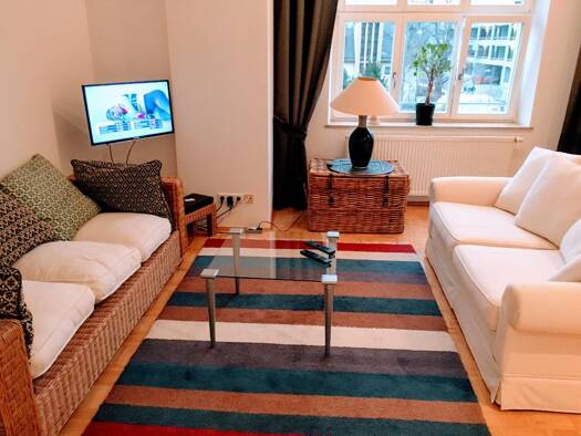 Helle, lichtdurchflutete und geschmackvoll möblierte 2-Zimmer-Wohnung mit WLAN in einem 2007 kernsanierten und gepflegten, denkmalgeschützten Altbau im beliebten Nürnberger Stadtteil Wöhrd. Perfekte Wohnlage mit Blick ins Grüne, nur wenige Gehminuten in das Stadtzentrum, Cramer-Klett-Park sowie zur Wöhrder Wiese. Die Möblierung des Wohnraums besteht aus einer 2-Sitzer-Couch, weißen ausziehbaren Couch mit Glastisch, Flatscreen-TV und einem schönen Esstisch mit 4 Stühlen. Die offene Wohnküche ist...
