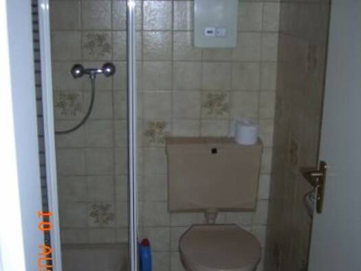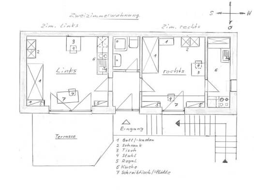 Das Zimmer ist rechts in einer 2 Zimmerwohnung. Die 2-Zimmerwohnung besitzt einen eigenen Eingang. Vom Eingangsflur sind die beiden Zimmer und das Bad erreichbar. Das rechte Zimmer hat einen 4-Plattenelektroherd mit Backofen , Dunstabzug, Kühlschrank, Spüle mit Kochendwassergerät und einem Oberschrank. Das gemeinsame Bad hat ein Waschbecken, eine Dusche und eine Toilette. Im rechten Zimmer ist ein neues Bett mit 3 Bettkästen, einem 2-türigem Kleiderschrank, 2 Regalen (rechts + links vom Fenster...