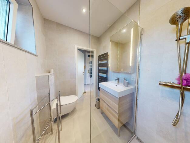 Wunderschöne, voll möblierte Wohnung im Erdgeschoss eines charmanten Dreifamilienhauses. Sie besteht aus einem großen Eingangsbereich, einem eleganten Wohn- und Esszimmer mit Kamin und einer voll ausgestatteten Küche mit direktem Zugang zu einer geräumigen Terrasse von 60 m2. Drei Schlafzimmer, von denen eines über ein eigenes Badezimmer verfügt, sowie eine Toilette mit Dusche vervollständigen den Wohnbereich. Im Untergeschoss befindet sich ein großer Waschraum, der mit Regalen und Schränken au...
