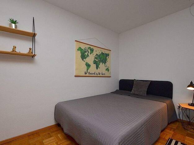 Zimmer Das Zimmer wird teilmöbliert vermietet und ist mit einem Bett (inklusive Matratze), einem Schreibtisch und einem Stuhl ausgestattet. Es bietet viel Tageslicht und ist großzügig geschnitten, hell und freundlich. Außerdem verfügt das Zimmer über einen eingebauten Kleiderschrank zur Aufbewahrung von Kleidung. Das Zimmer befindet sich in einem separaten Bereich der Wohnung. Die Wohnung hat zwei Eingänge mit einer Tür dazwischen, sodass es sich eher wie eine 2er-WG anfühlt. Es gibt ein kleine...
