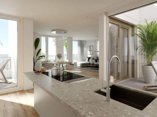 Diese attraktive 2-Zimmer-Wohnung im 3. Obergeschoss der Meiller Gärten bietet ca. 80,71 Quadratmeter. Der großzügige Wohnbereich mit offener, hochwertiger Einbauküche öffnet sich auf die Loggia mit ...