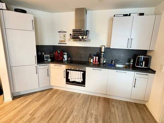 Die modern und hochwertig ausgestattete Wohnung verfügt über eine geräumige Einbauküche, zwei Schlafräume und ein separates Büro/Ankleidezimmer und einen Balkon, den man aus dem Wohnzimmer erreicht. ...