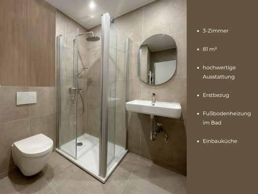 Die Wohnung überzeugt durch eine moderne, durchdachte Ausstattung, die hohen Wohnkomfort mit ökologischer Verantwortung verbindet. Das Gebäude wurde in KfW QNG NH-zertifizierter Massivbauweise errichtet - ein Qualitätssiegel für nachhaltige Bauweise, Energieeffizienz und gesundes Wohnen. Eine effiziente Luft/Wasser-Wärmepumpe sorgt ganzjährig für behagliche Temperaturen, während die dezentrale Warmwasserbereitung über moderne elektronische Durchlauferhitzer eine energiesparende Versorgung siche...
