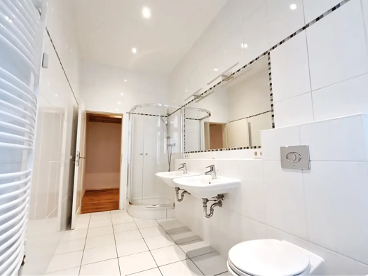 Objektreferenz: FIO-10917330120 Diese charmante Dachgeschosswohnung befindet sich in einem gepflegten Mehrfamilienhaus aus dem Jahr 1920 und bietet eine Wohnfläche von ca. 125 m². Der Eingangsbereich führt zunächst rechts zum stilvollen Tageslichtbad, das mit einer großzügigen Dusche, einer Badewanne, zwei Waschtischen, einer Toilette sowie einem Bidet ausgestattet ist - hier findet sich ausreichend Platz für eine wohlverdiente Auszeit. Links vom Eingang befindet sich die Waschküche, von der au...