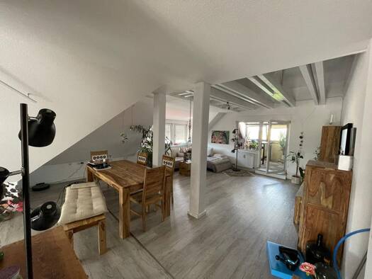 * Wohnen im Dachgeschoss eines ruhigen Mehrfamilienhauses * Ebene 1: * Ca. 35 qm großer Wohn-Ess-Bereich mit direktem Zugang zur sonnendurchfluteten Loggia und mit Treppe zum oberen Bereich * Helle K...