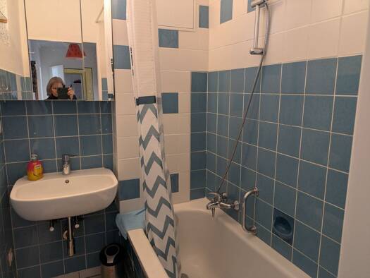 Alle Zimmer gehen von einem geräumigen Korridor ab. Es gibt ein helles Wohnzimmer nach Norden mit ca. 16 qm, nach Süden ein ruhiges (man kann bei offenem Fenster schlafen) kleines Schlafzimmer mit ca...