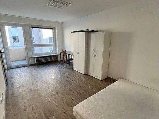 Die helle Wohnung liegt direkt am Bayernpark und verfügt über einen Balkon zum Innenhof. Über die Eingangstür gelangt man in einen geräumigen Flur mit Garderobe und reichlich Staumöglichkeiten. Von dort führt eine Tür ins Badezimmer mit WC und Dusche, eine andere in den offenen Wohn- und Schlafbereich. Dieser bietet Platz für Bett, einen großen Kleiderschrank, Esstisch, Schreibtisch und eine Kommode. Der Raum verfügt ebenfalls über eine Einbauküche. Dank der großen Doppelfenster und Balkontür g...