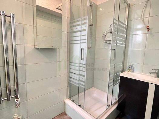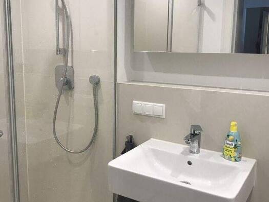 Es befinden sich neben dem Bad mit Dusche und WC ein Gäste WC sowie eine große Einbauküche mit Herd und Ceranfeld in der Wohngemeinschaft. Im Badezimmer gibt es zwei Waschbecken und eine große Dusche