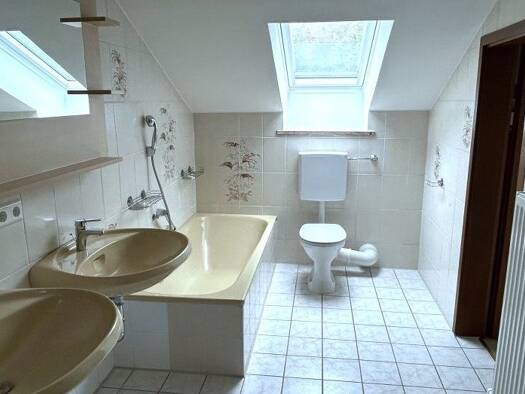 Die Dachgeschoss-Wohnung mit ca. 106 m² Wohnfläche befindet sich im 1. OG eines 3-Familienhauses. Die Immobilie ist mit einer großen Dachterrasse sowie einem großen Balkon zur Südseite ausgestattet. Wohnzimmer mit neuem Parkett und Schiebetüren zum Balkon. Elektrische Markise, Bad mit Dusche, Wanne und Doppelwaschbecken. Separates WC. Abstellraum mit Fenster. Geräumige Wohnküche (ohne Einbauten). Zur Wohnung gehören ein Kellerraum, ein Stellplatz für Fahrräder und ein eigener Platz für Waschmas...