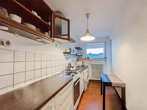 Gemütliche 2-Zimmer-Wohnung im Dachgeschoss eines Mehrparteienhauses. Die Wohnung hat ein schickes Bad mit Dusche, grauen Bodenfliesen und weißen Wandfliesen, sowie einem Handtuchheizkörper. Die Bode...